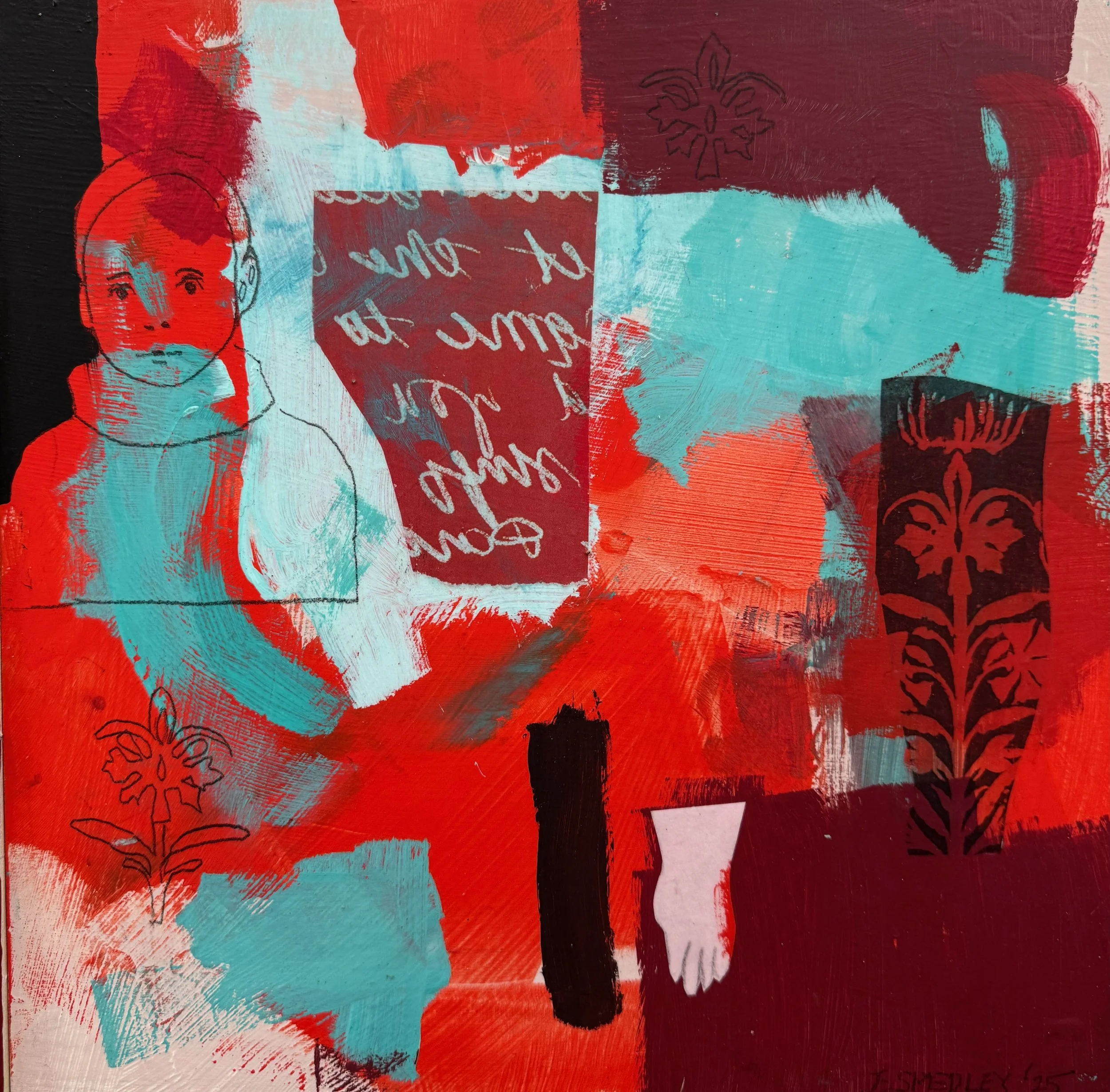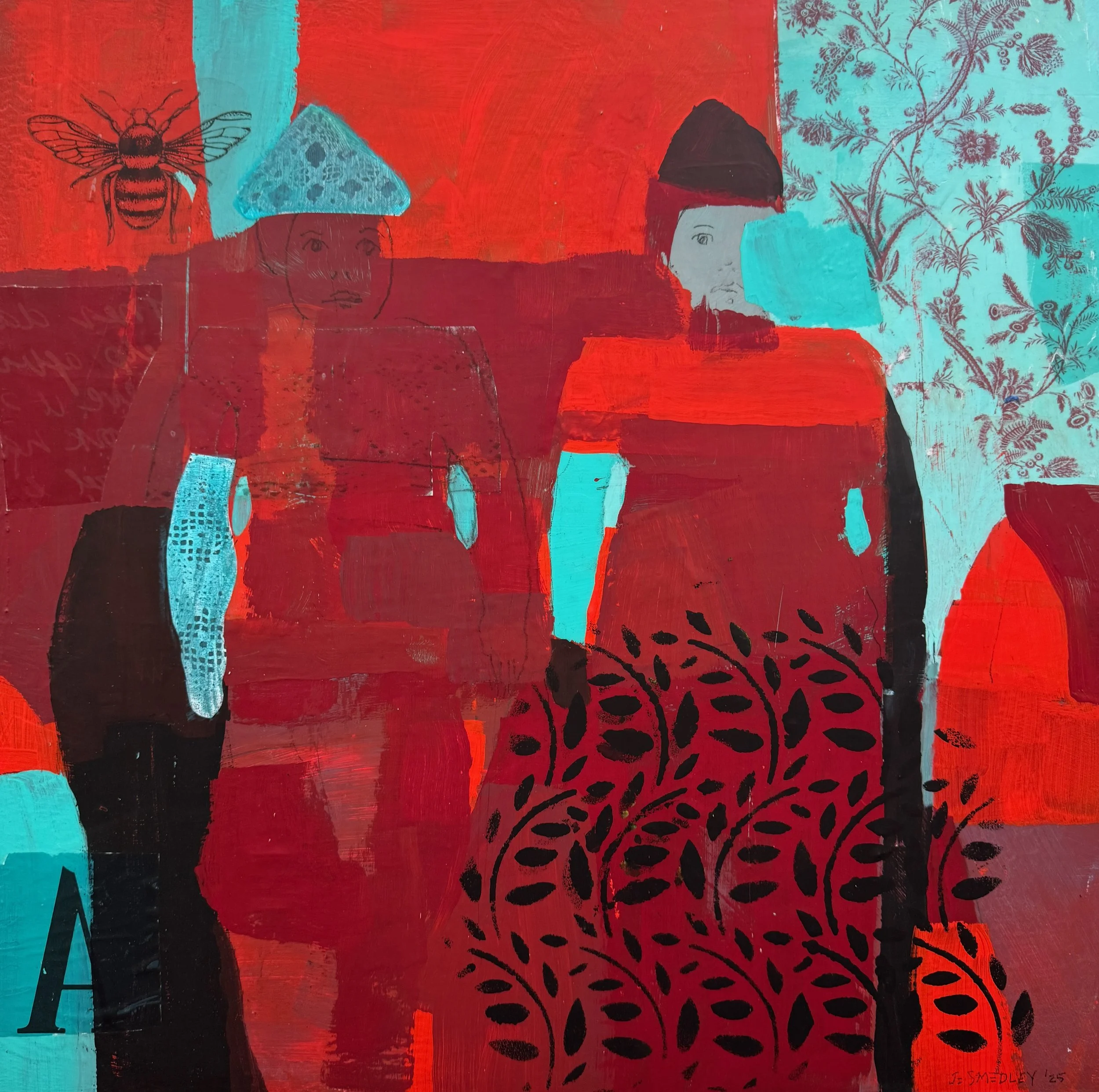 Working in a bold palette of teal and red, I combine painting with collage and image transfer, layering patterns, textures, and figures. This process allows me to weave together fragments of imagery—botanical motifs, historical ornament, and hand-drawn figures—into surfaces that echo both the richness of textiles and the intimacy of the body. The figures, partially revealed and partially obscured, seem to carry their adornments like coded language, speaking of lineage, memory, and aspiration.