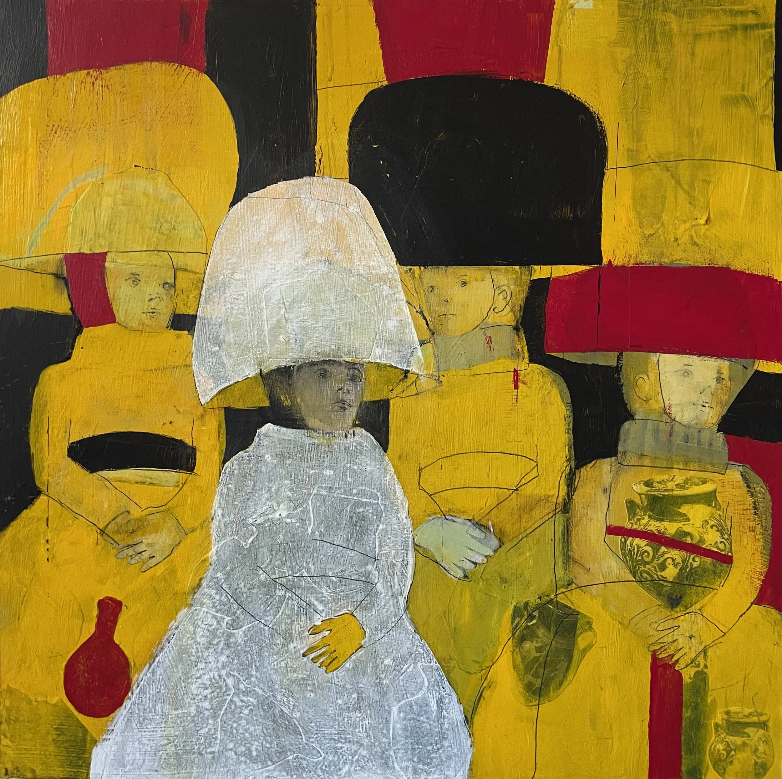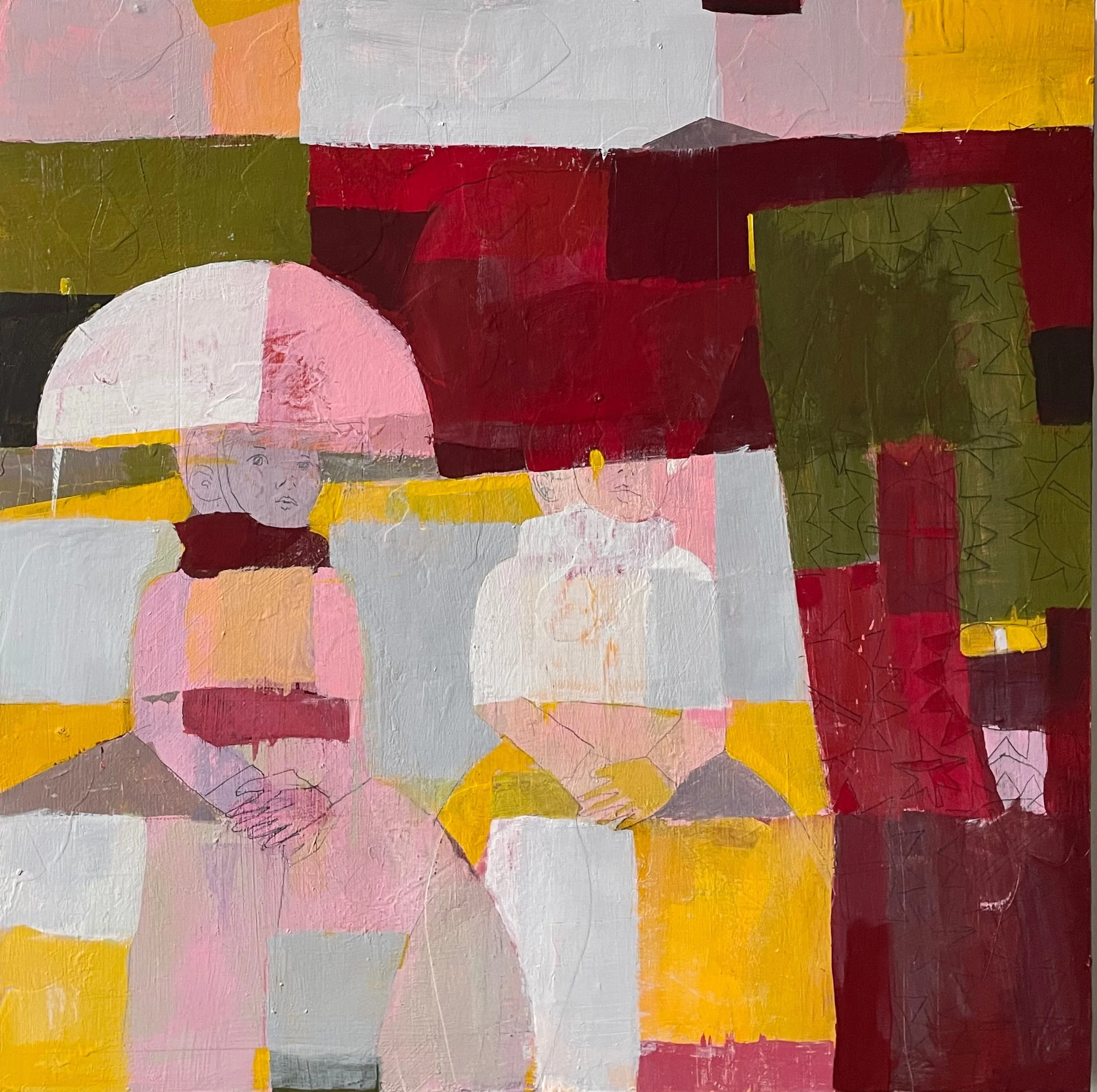 Embedded within these quilt-like structures are line drawings of human figures, quietly present and often only revealed through close looking. These figures serve as subtle reminders of our shared humanity—woven into the fabric of history, memory, and imagination.
