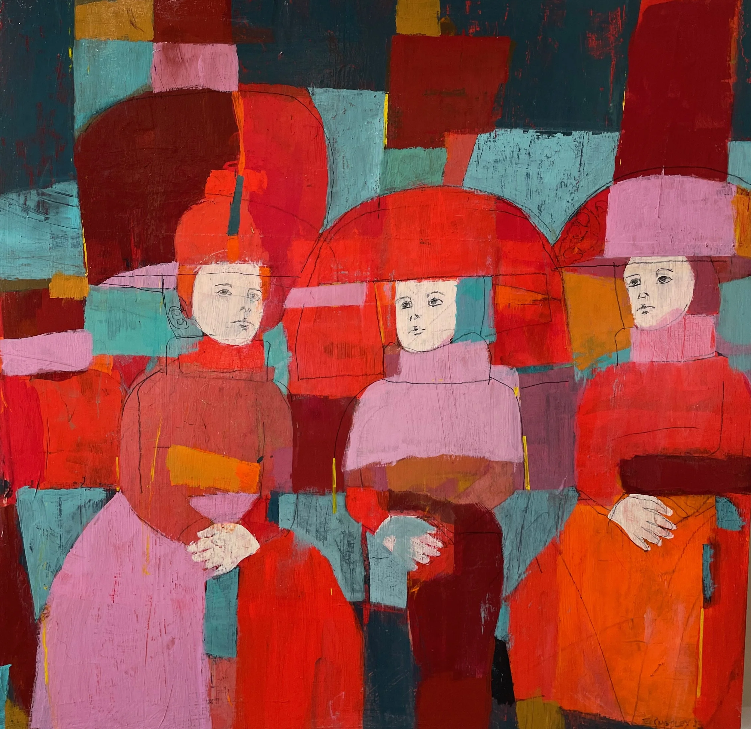 The Woven series is an exploration of harmony through contrast—where light and dark, bright and muted, warm and cool coexist side by side. In these works, I layer color in a way that recalls the patchwork rhythms of quilts and the intricate surfaces of medieval tapestries. Each painting becomes a kind of textile in paint, a constructed surface where fragments and tones interlock like threads.